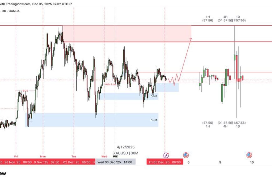 Emas (XAUUSD) hari ini, Jumat 5 Desember 2025, masih bertahan di sekitar zona USD 4.200 setelah sempat bergerak volatil. Secara teknikal, harga sedang konsolidasi di tengah range: di bawahnya ada area demand H1 yang beberapa kali menahan penurunan, sementara di atas terbentang zona resistensi kuat sekitar 4.246–4.264 yang menjadi target jika buyer kembali dominan. Selama demand ini terjaga, bias jangka pendek masih condong ke potensi lanjutan kenaikan menuju area atas range tersebut.