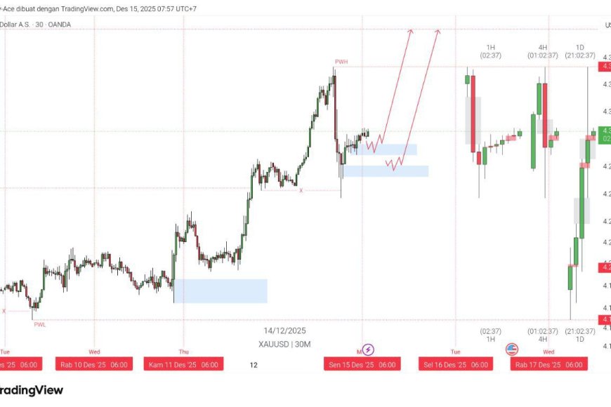 Outlook harian 15 Desember 2025: XAUUSD menguat di area 4,32xx saat DXY bertahan lemah di 98,4. Fokus pasar ke data tenaga kerja AS dan arah suku bunga, dengan gold jadi pair favorit hari ini. Hubungi tim AsiaproFx untuk update ringkas.