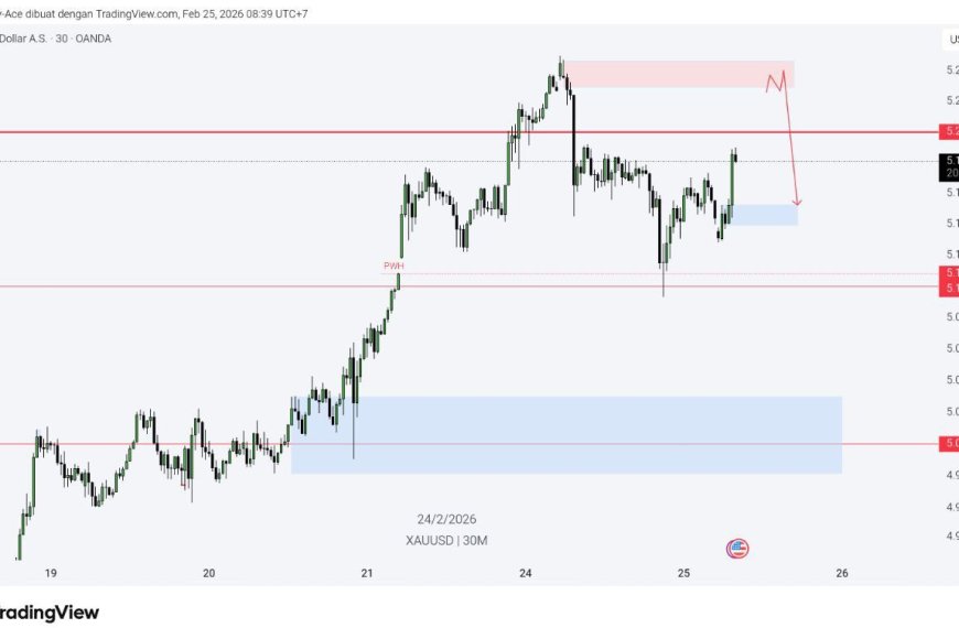 Secara teknikal Gold (XAUUSD M30) dari chart, harga sedang rebound dan mendekati area kunci 5.200. Di atasnya terlihat jelas zona supply 5.220–5.240 yang berpotensi menjadi area reaksi/penahanan jika pasar mulai profit-taking. Di bawah, zona demand 5.140–5.160 menjadi bantalan terdekat jika terjadi pullback. Support lanjutan yang menonjol ada di sekitar 5.108 dan area psikologis 5.000 (zona biru besar) yang menjadi “lantai” penting bila volatilitas membesar.