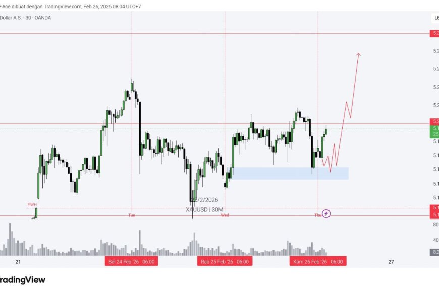 Dari chart XAUUSD M30, emas terlihat memantul dari zona demand 5.150.000-an (area biru) dan mencoba membangun pijakan untuk dorongan lanjutan. Selama area bawah ini bertahan, fokus berikutnya tetap ke 5.200.000 sebagai “gerbang psikologis”; jika tembus bersih, ruang ke 5.260.000–5.300.000 kembali terbuka. Tapi kalau tekanan turun menembus 5.108.000–5.100.000, bias naik melemah dan market berpotensi balik agresif ke bawah.