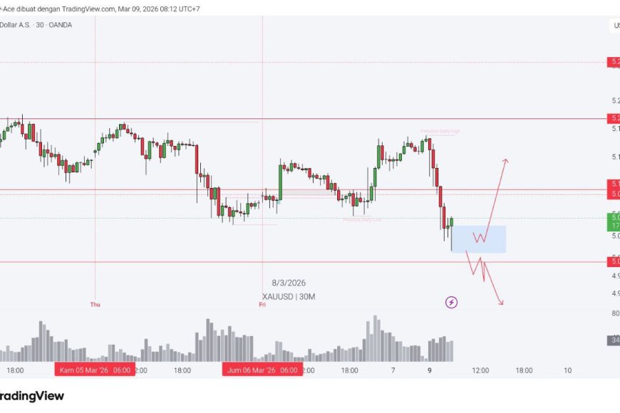 Dari sisi teknikal, gold pada chart 30 menit masih terlihat tertekan setelah gagal bertahan di area 5.100. Harga turun cepat ke zona demand sekitar 5.030–5.060 yang sekarang jadi area penting. Selama area ini bertahan, emas masih punya peluang rebound kembali menguji 5.093 hingga 5.100. Tetapi jika area bawah ini ditembus, tekanan bisa berlanjut menuju 5.000.
