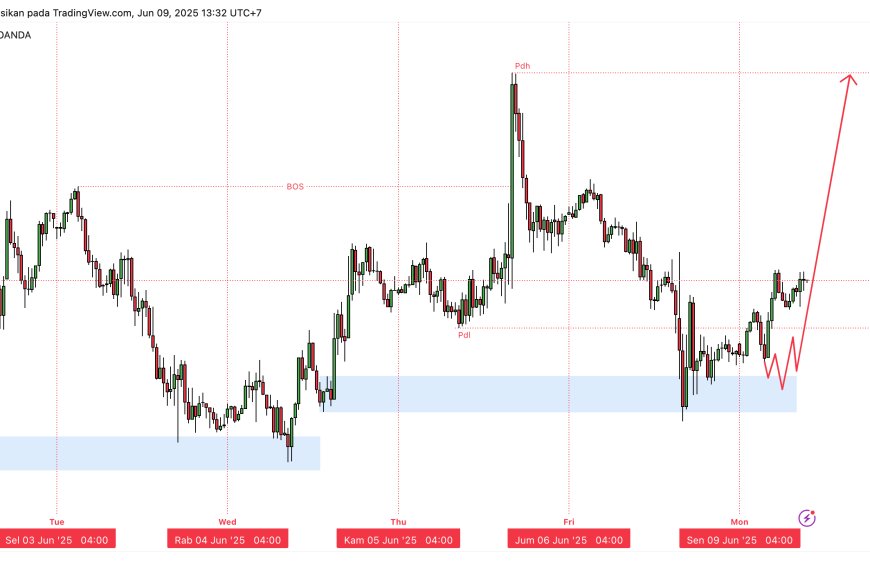 1.1300 – 1.1210: Key demand zone dan low sebelumnya (29 Mei), jika ditembus, akan menggeser struktur ke bearish.