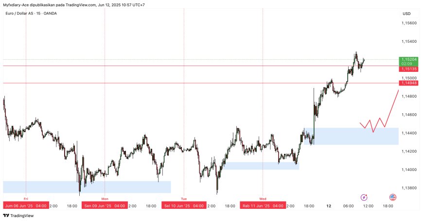 Imbalance & Demand Zone : Terlihat zona yang valid antara 1.14350 – 1.14550, tempat harga berpotensi retrace untuk akumulasi order.