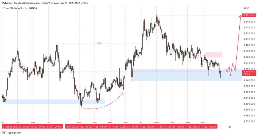 Harga saat ini menguji demand zone kuat di area 3.340 – 3.355.