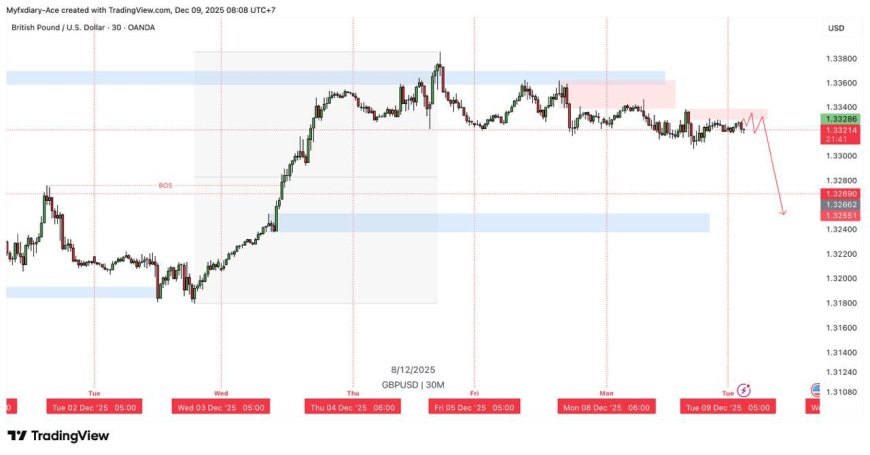 Pada D1, GBPUSD baru saja bangkit dari low November, tapi kini tertahan di sekitar 1.33–1.335 yang tampak sebagai zona resistensi harian. Secara intraday sebelumnya juga terlihat supply yang beberapa kali menahan kenaikan.